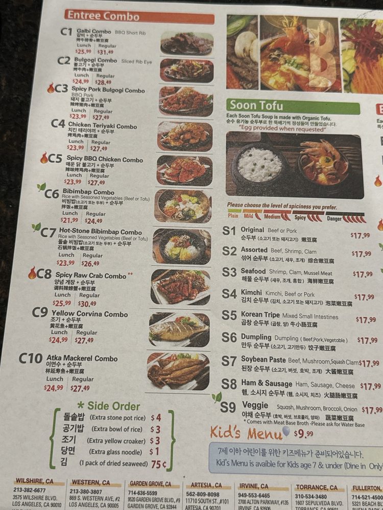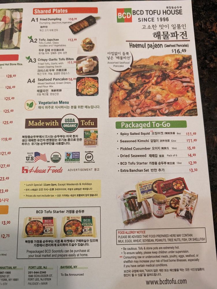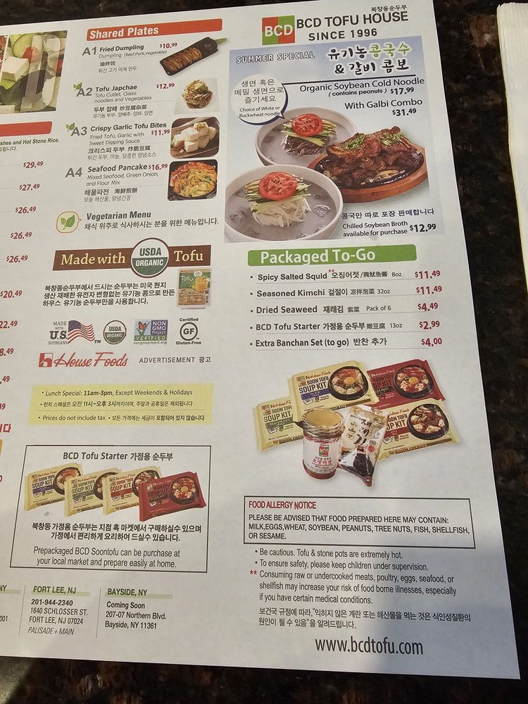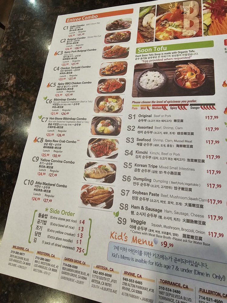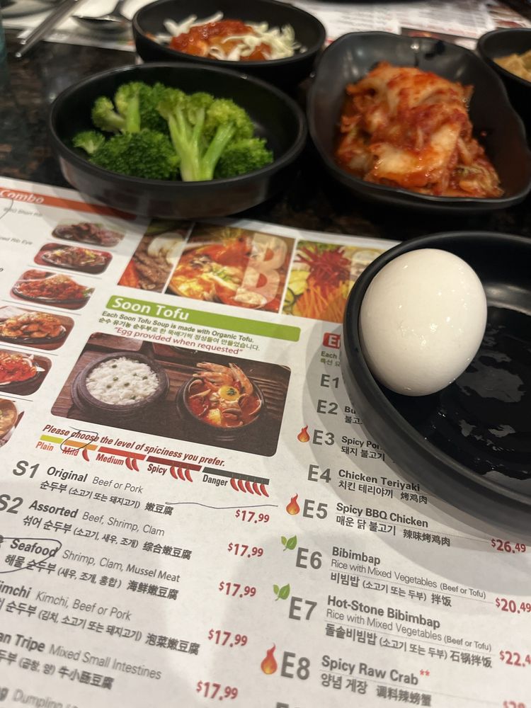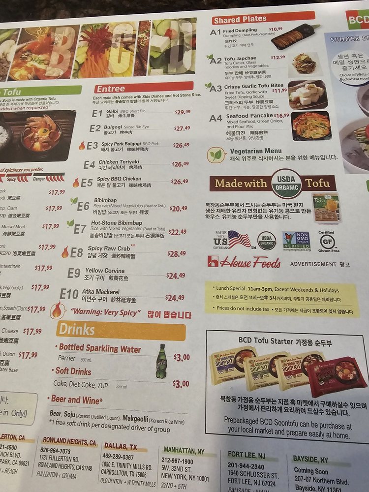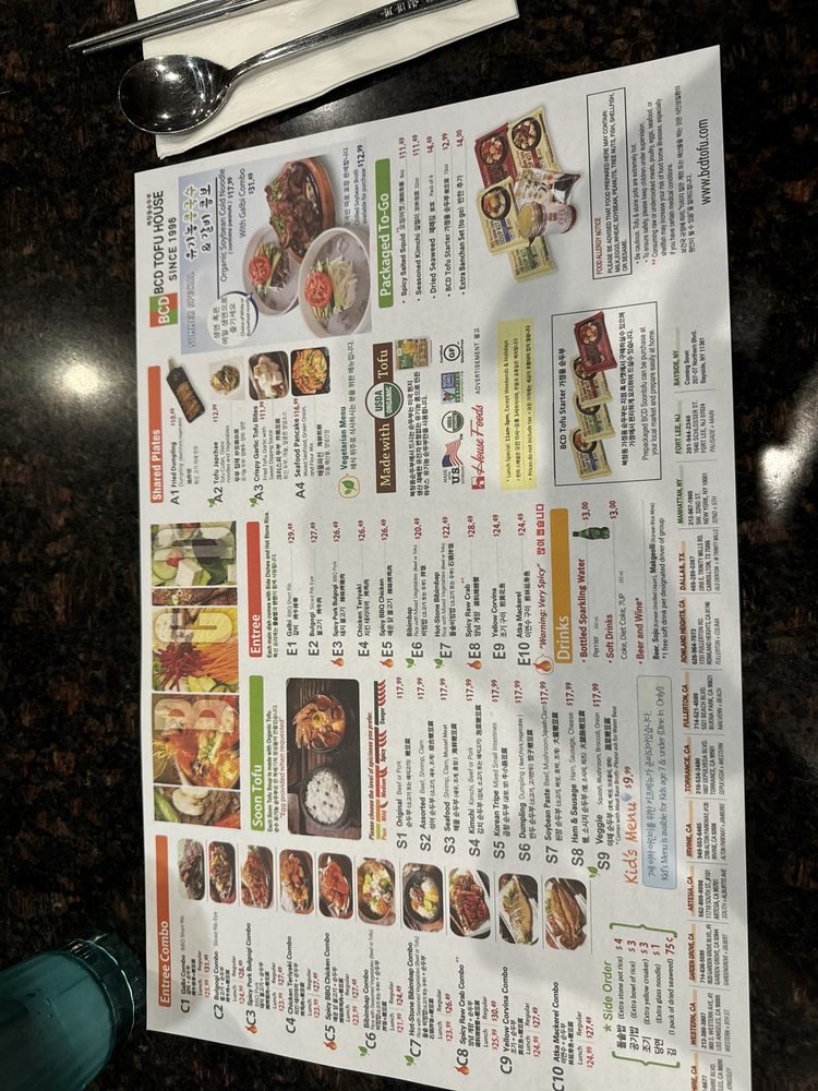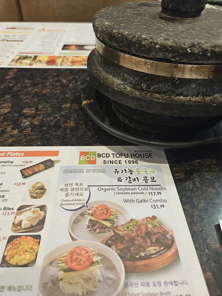 Introducing the diverse menu of BCD Tofu House, a renowned Korean cuisine spot in Los Angeles. Known for their flavorful soft tofu soups, the menu offers a wide array of options, including vegetarian and spicy variations, all complemented by generous banchan sides. Customers rave about the spicy raw crab combo and the assorted soon tofu with beef, shrimp, and clam. The galbi combo, featuring a smaller size of tofu soup, is a favorite among diners. Prices are reasonable, making it ideal for quick lunches or dinners. The casual atmosphere, ample seating, and friendly staff add to the overall dining experience. Don't miss out on their signature dishes like the original soon tofu with beef for a satisfying meal. BCD Tofu House offers a delightful culinary journey for both Korean food enthusiasts and first-timers alike.